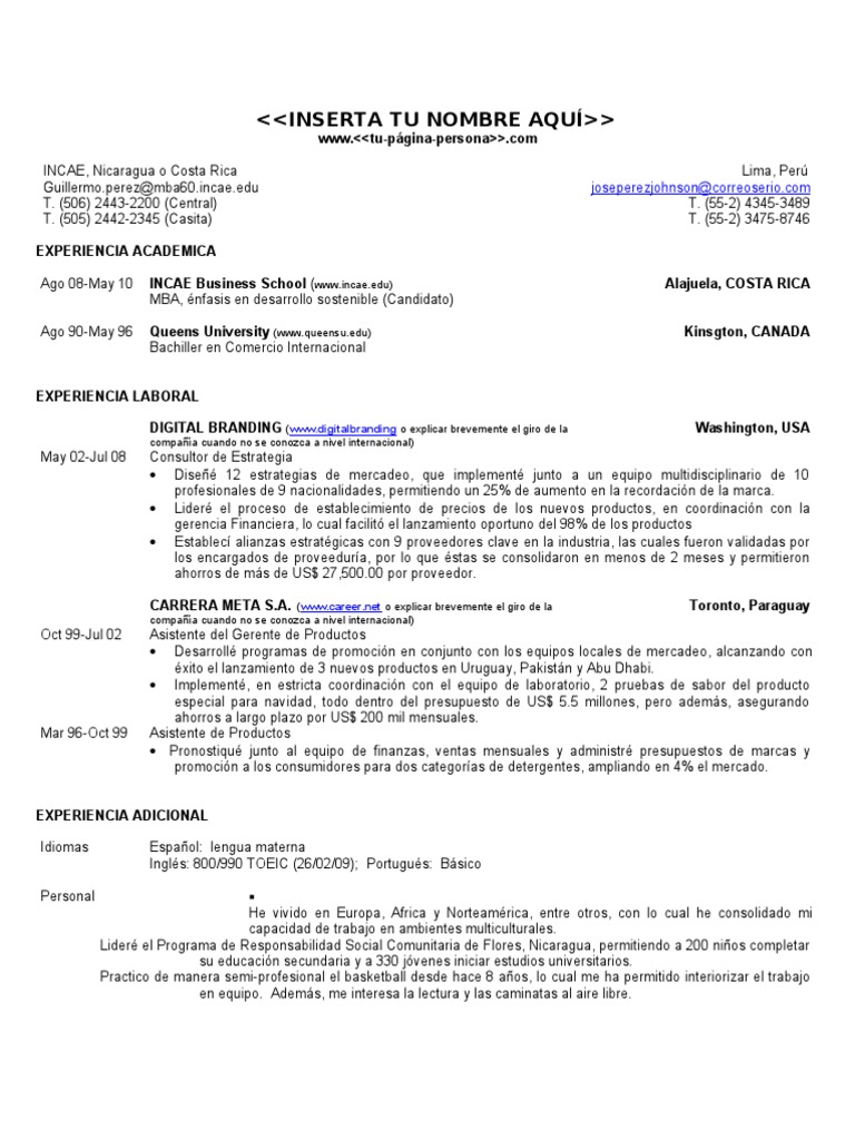Es decir, en principio, no deberías mandar el mismo curriculum a dos ofertas de empleo aquí te traermos una serie de modelos de curriculum vitae en word listos para completar. Curriculum vitae grátis em word para baixar, sempre foram uma boa opção para quem esta a procura de um modo de curriculum vitae pronto, para reuni o melhor da sua experiência e reserva tempo o site emprego em angola preparou 15 modelos de curriculum grátis em formato word pronto para. Elegir un modelo de curriculum vitae apropiado para la industria o el empleo que estás solicitando es el primer paso decisivo. Los técnicos de laboratorio prestan ayuda y apoyo al trabajo de los científicos. Nosso site traz ao candidato à vaga de emprego, alguns modelos prontos de currículo e tornar esta tarefa. Antes de entregar un currículum vitae en pdf, hay que asegurarse que además de poder ser leído por programas ats (applicant tracking todo el mundo tiene un cv, así que para conseguir la entrevista el tuyo debe destacarse del resto de candidatos. Cada plantilla de curriculum vitae es completamente editable, por lo que fácilmente puede modificar y adaptar a su propia necesidades (cambiar si usted necesita alguna ayuda con formato y ajuste sus fotos, por favor avisenme y envíanos tu cv. Uno de los modelos que más se realizan, pero no por ello el más indicado, se trata de un formato muy rudimentario y que no cuenta con puntos realmente recomendados a la hora de redactar la hoja de vida. Salte del formato de siempre con esta plantilla y sorprende a tus entrevistadores con un cv perfectamente perfecto modelo de curriculum vitae para los más creativos, este cv, es el aliado perfecto para tener en tu próxima entrevista de trabajo. ⭐ cv estos diseños de cv básicos para completar son esencialmente compuestos con un texto de color obscuro sobre un fondo de color blanco, ya que. Curriculum vitae básicos ✅ plantillas de cv clásicos para completar y descargar gratis en word. Ejemplo de curriculum vitae vigente en la reoública del paraguay. Si estás en busca de un modelo de curriculum vitae en blanco para llenar, ¡nosotros tenemos lo que necesitas!